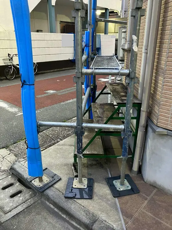 ビケ足場という足場で、ハンマー1つで組み立てと解体が可能な足場です。
