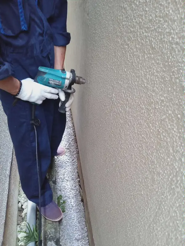 すでにシロアリの被害に遭っていたため、バリア工法という壁に穴を開けて薬剤を注入しました。