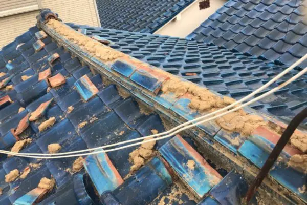 屋根の瓦が割れていたり飛ばされたりして中の土が見えていました。