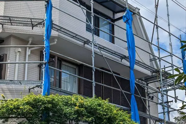 東京都中野区のK様より、屋根カバー工法・外壁塗装のご依頼をいただきました! 工事完了までの様子を随時お伝えしていきます! 現場調査の様子はこちら   【11月29日】着工~足場設置 事前に打ち合わせをしていたスケジュールで着工することができました。 まずはお住まいの周りを囲うように足場を設置し、さらにその周りに塗料などの飛散を防ぐ養生シートを張りました。 高所での外装工事には基本的に足場を組みます。 これにより安定した足場ができ、職人たちが安全に作業ができます。 ・・・