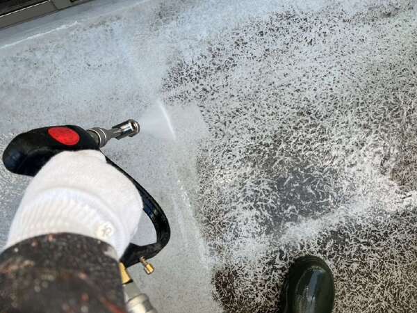 防水材を施工する前に、高圧洗浄で床面の汚れをしっかり落としていきます。
