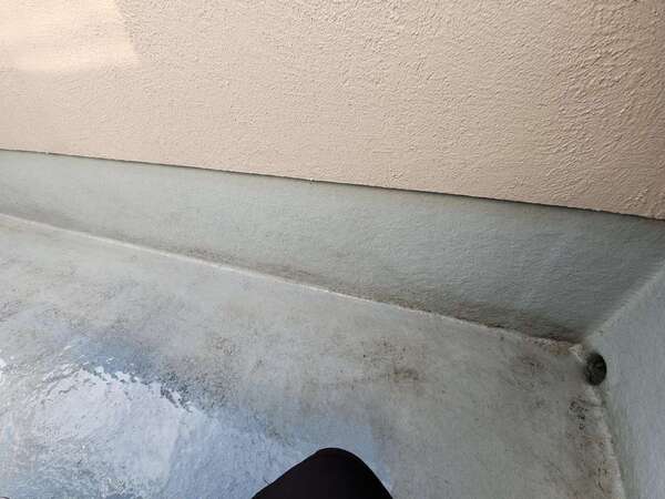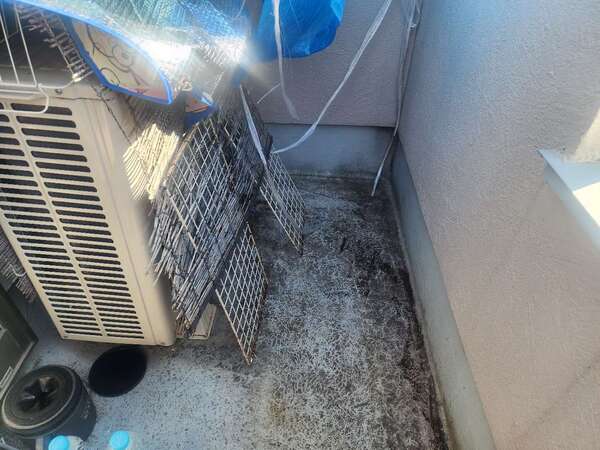 ベランダ床面には黒ずみやコケ、長年の汚れの蓄積が見られ、特に立ち上がり部分には水が回ったようなシミや変色が確認できる状態です。