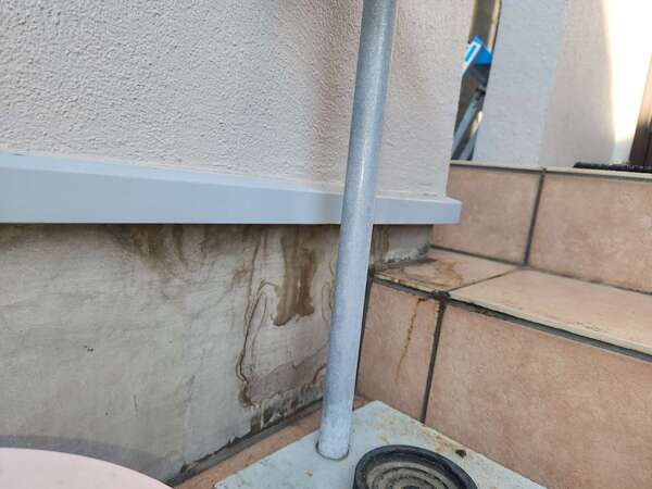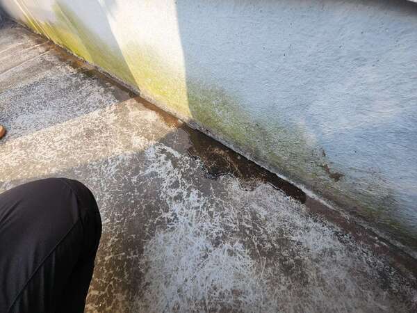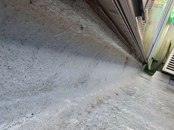 壁際や段差まわりには、雨だれのような跡や水染みが見られ、場所によっては水が滞留・浸み込んでいる可能性が考えられる状況でした。
