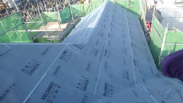 ↓は、ルーフィングシート(防水シート)を張る作業の様子です。