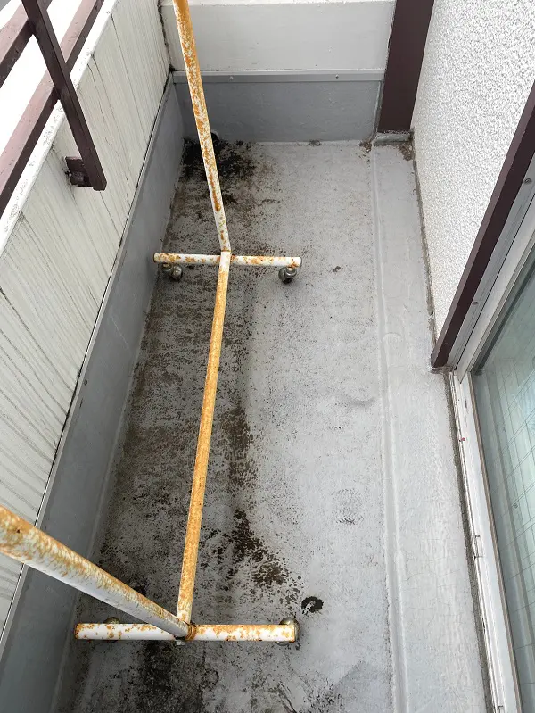 まず、ベランダの床面は土や汚れが残り、水はけが悪い状態でした。