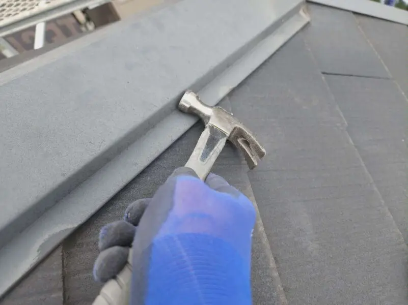 釘は玄能を使って再打ち込みします。釘ではなくビスを使うこともあります。下地に効いていることが重要でして、もし下地が腐食している場合は、釘を打ち込んでも効いてくれませんから意味がありません。下地が腐食している場合は、下地と一緒に棟板金の交換が必要です。